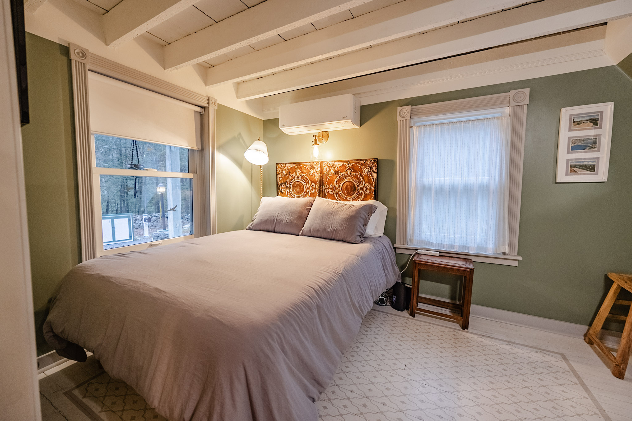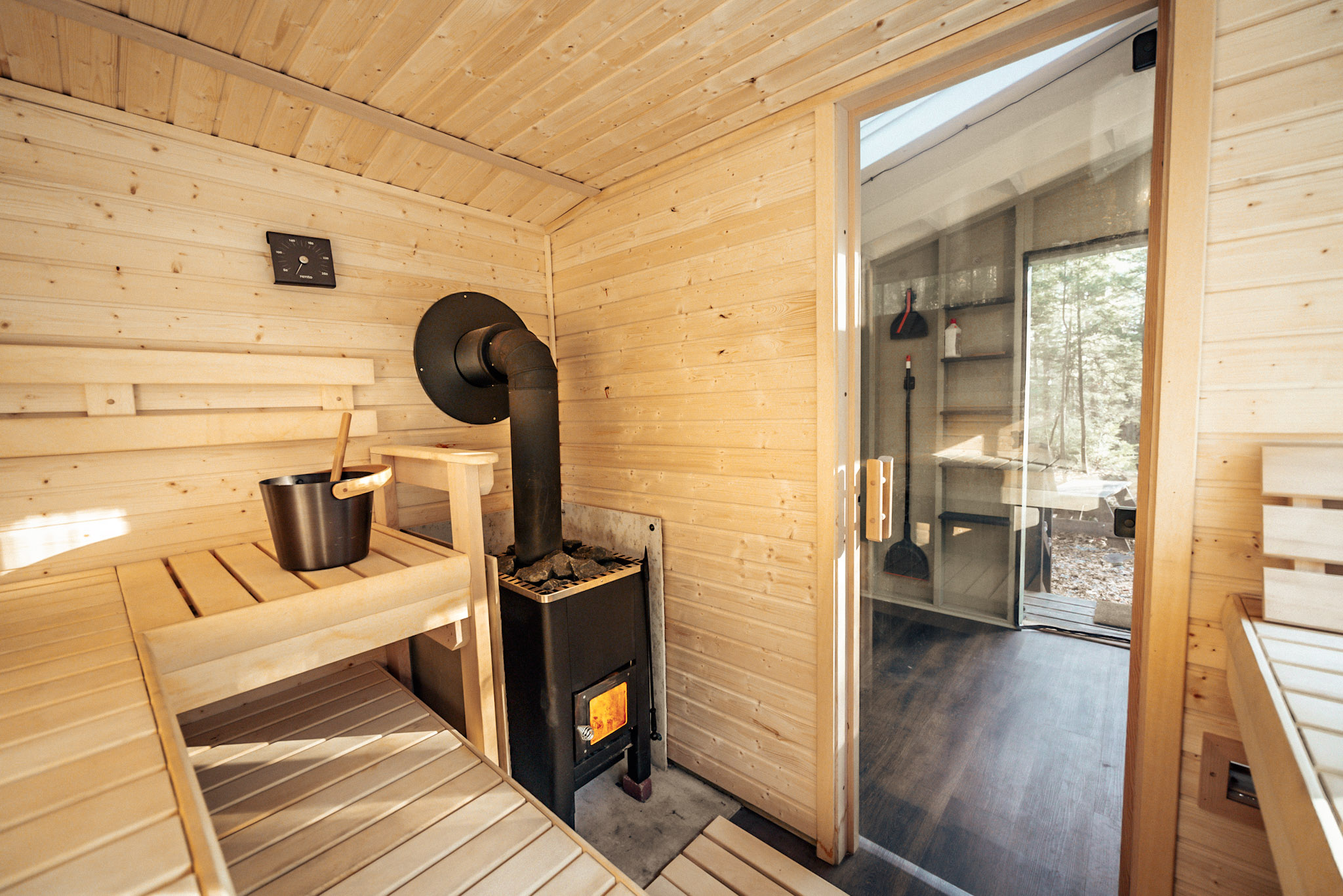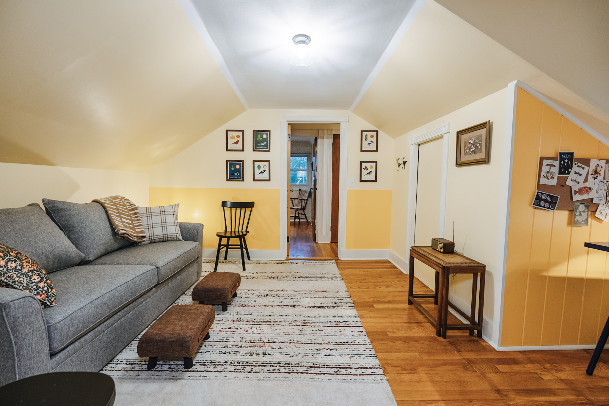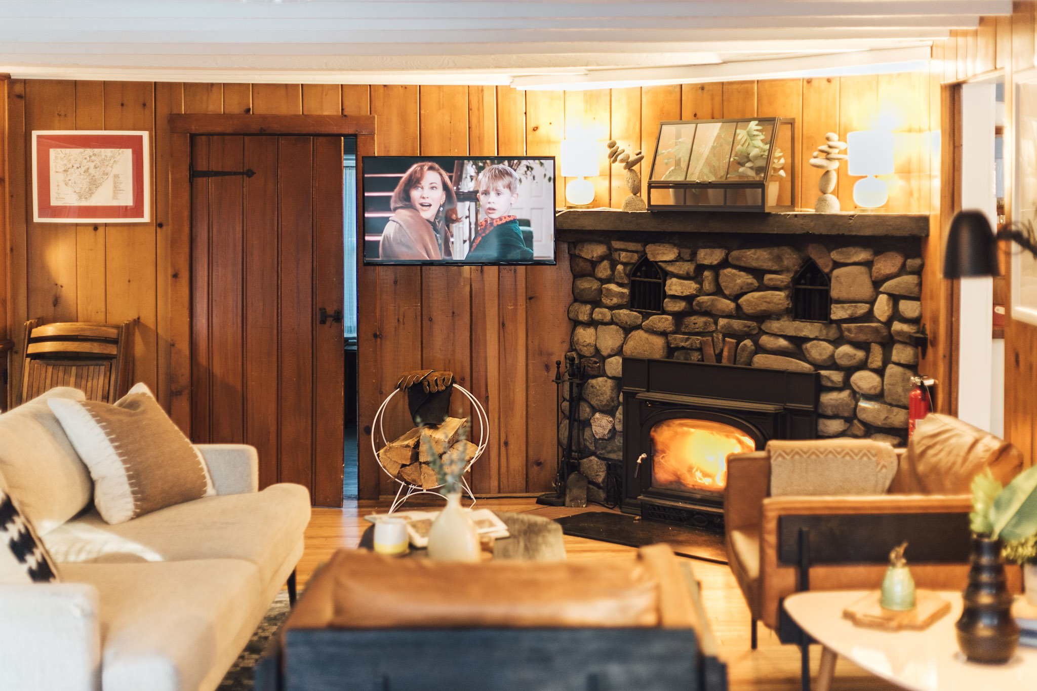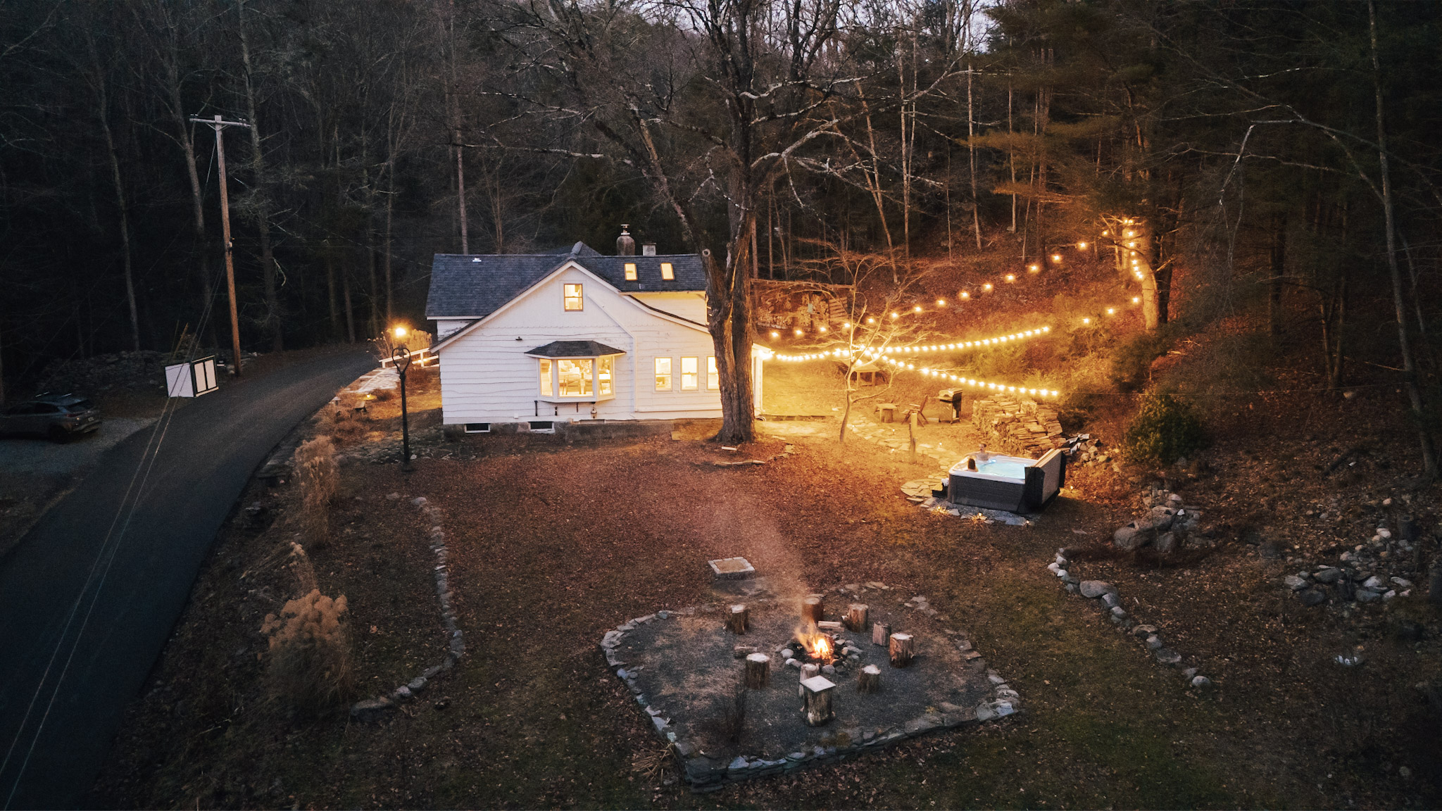 The Cabin: The main level of the cabin is very spacious with original wood paneled walls and exposed beams. There is a convenient mudroom when you walk in. As you walk through, you will find yourself in the living and dining area. There is plenty of couch seating around the fireplace and a large picture window next to the dining table. There is a convenient first floor bedroom off the living area. In addition to the living room, there is another seating area with a fireplace and plenty of sunlight. There is a full size kitchen with a small breakfast table. The full size bathroom can also be found on this floor. Upstairs, you will find the primary bedroom with sunlights overhead. The 3rd bedroom is upstairs as well and has its own staircase down to the kitchen. The middle room upstairs doubles as a reading/work area and a 4th bedroom when necessary as the couch pulls out to a full size bed. Outdoor space: Right out the back door you will find a large outdoor dining area, a BBQ grill, hot tub, firepit, and outdoor games. The garage is fitted as a basic gym for guests to keep up their routines and let loose. To the side of the garage you will find a path that leads down to the stream. At the stream, you will find our custom sauna, an additional fire pit and a relaxing hammock. This area is particularly special, and just sitting out there in nature is an experience on its own.